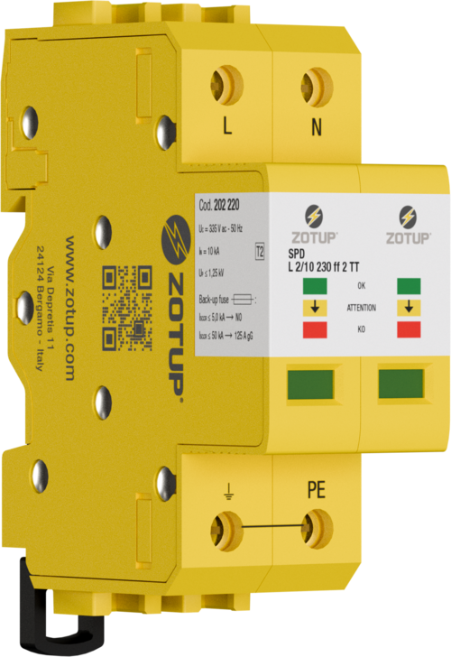 Pre-assembled bipolar, limiting surge arrester. &` typically installed in secondary distribution panels (SQBT) in 230 V single-phase circuits, both in TT systems downstream of the RCD differential switch, and in TN systems, presenting a notable level of protection (Up < 1kV at 5kA of In 8 /20 μs) achieved thanks to the possibility to be able to use the CT1 (2+0) type connection according to the HD 60364-5-534 standard. This arrester is also available with remote remote signaling contact (model L 2/10 230 t ff 2 TT), with code 212 220.